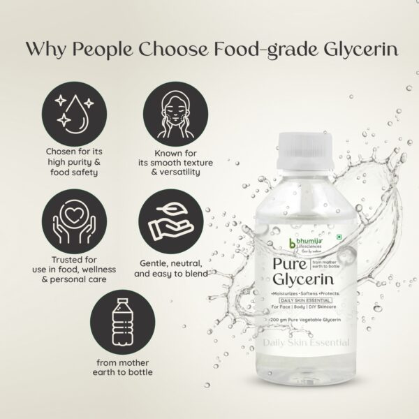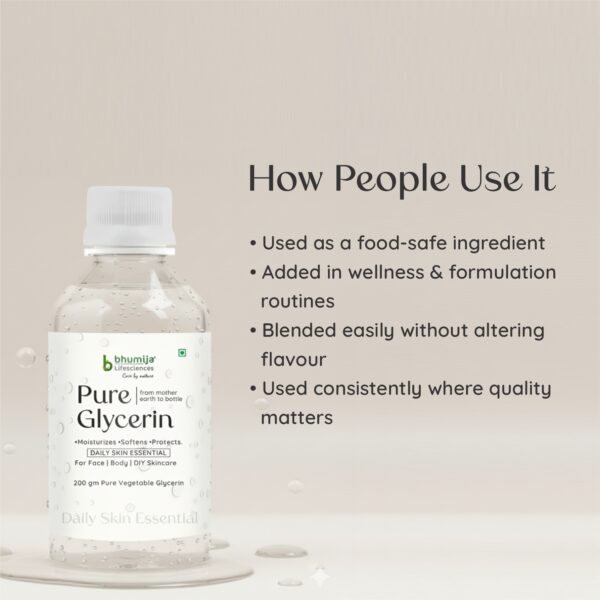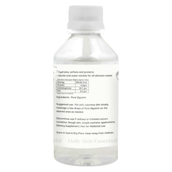 The benefits of glycerine are to hydrate the skin, protect the skin, reduce dryness, support quick healing, nourish the outer layer of the skin and more. It is also good as a hair care product. Pure glycerin is also famous in bakeries as a sweetener.