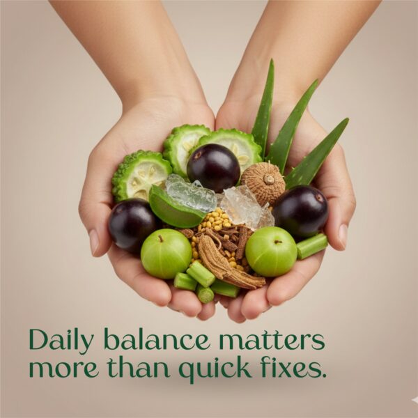- Helps to Maintain Healthy Blood Sugar Levels – Herbs like Jamun, Aloe Vera, Karela, Amla, Harad, Baheda, and Giloy work together to balance glucose levels naturally.