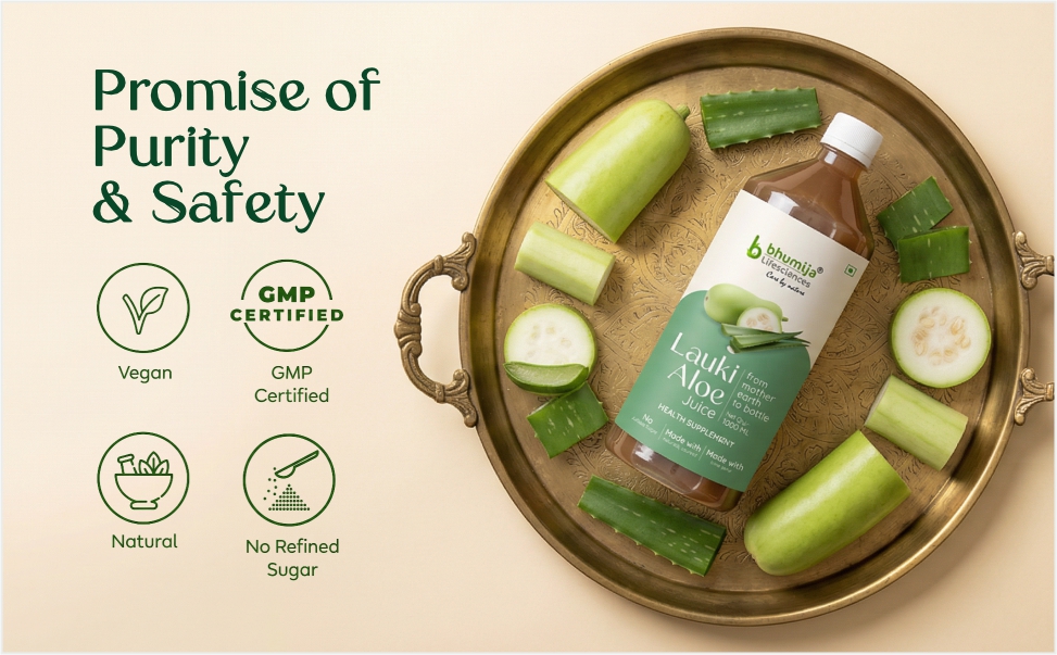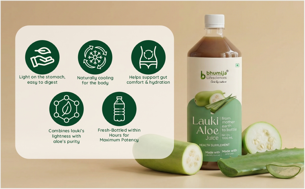 Bhumija Lifesciences Lauki Aloe Vera Juice combines the cooling power of Lauki (Bottle Gourd) with the soothing, detoxifying benefits of Aloe Vera creating a perfect daily health tonic for modern lifestyles.
