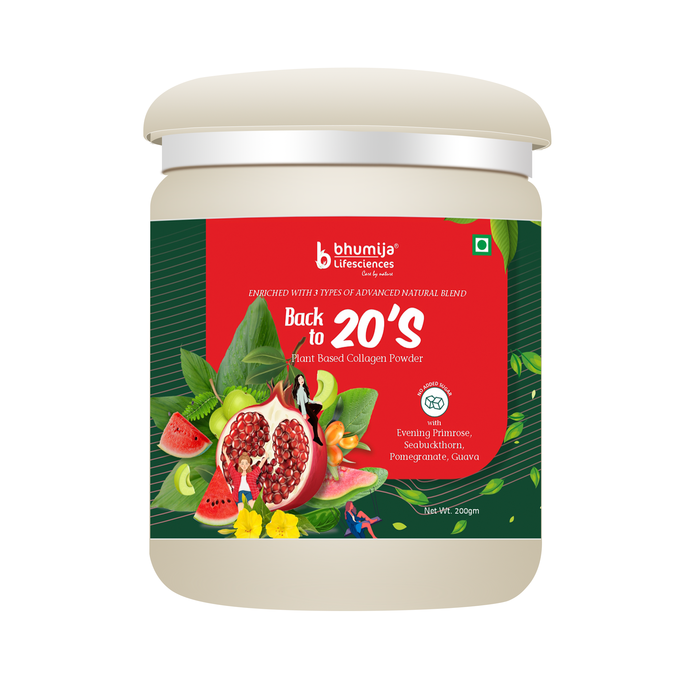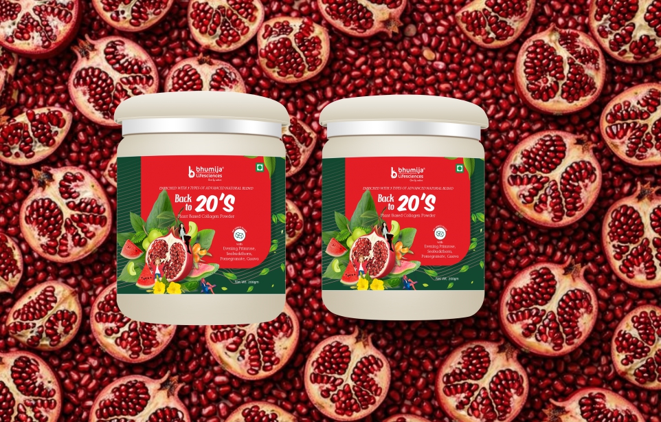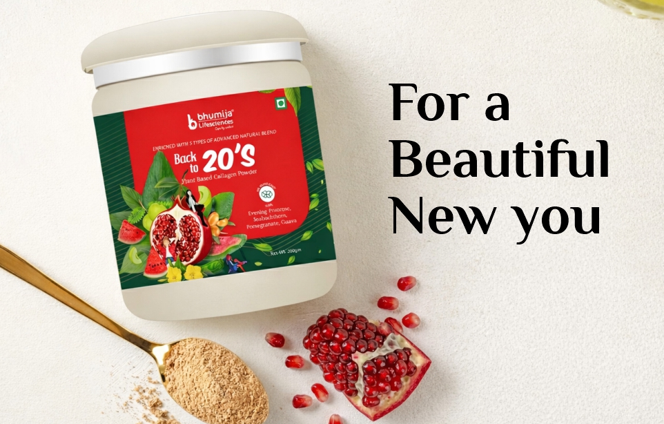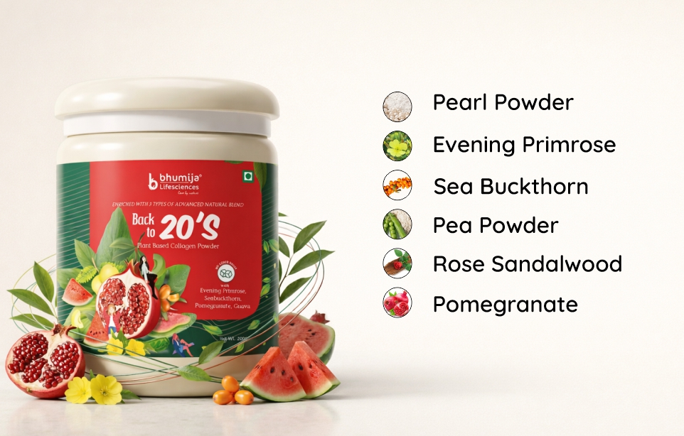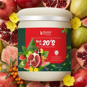 Bhumija lifesciences Plant-Based Collagen Powder blends Evening Primrose, Sea Buckthorn, Pomegranate, Guava, and Rose extract to support firmer, smoother and naturally glowing skin. A clean, vegan collagen builder that helps improve hydration, elasticity and radiance without animal collagen. With natural Vitamin C from fruit extracts, this collagen builder supports the skin’s own collagen-making process, helping improve firmness and smoothness over time