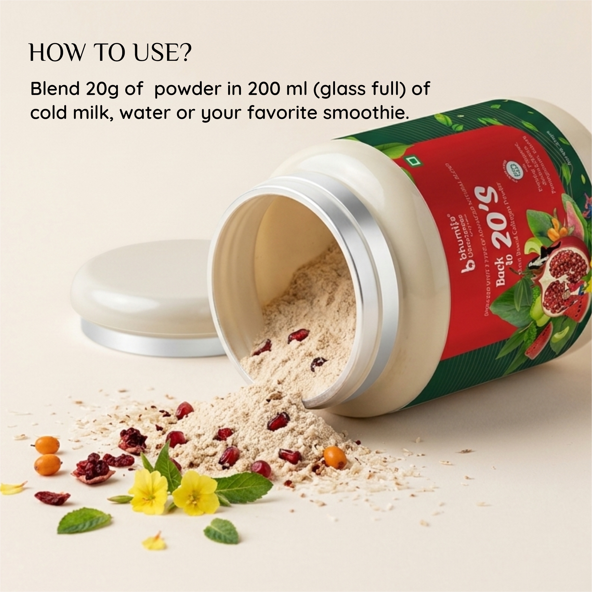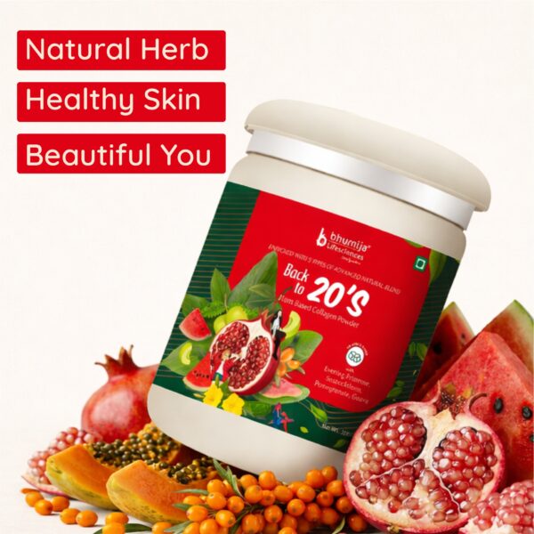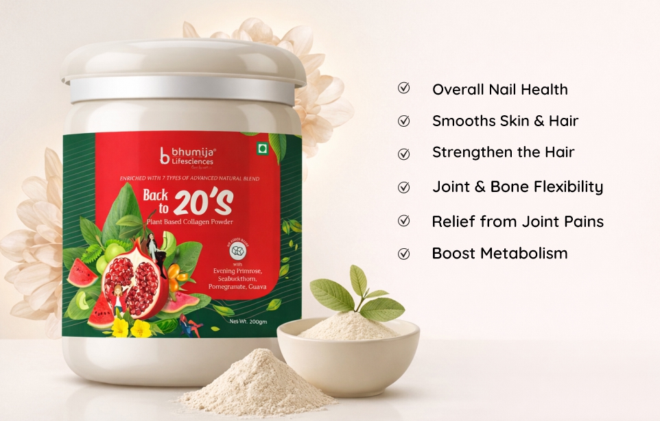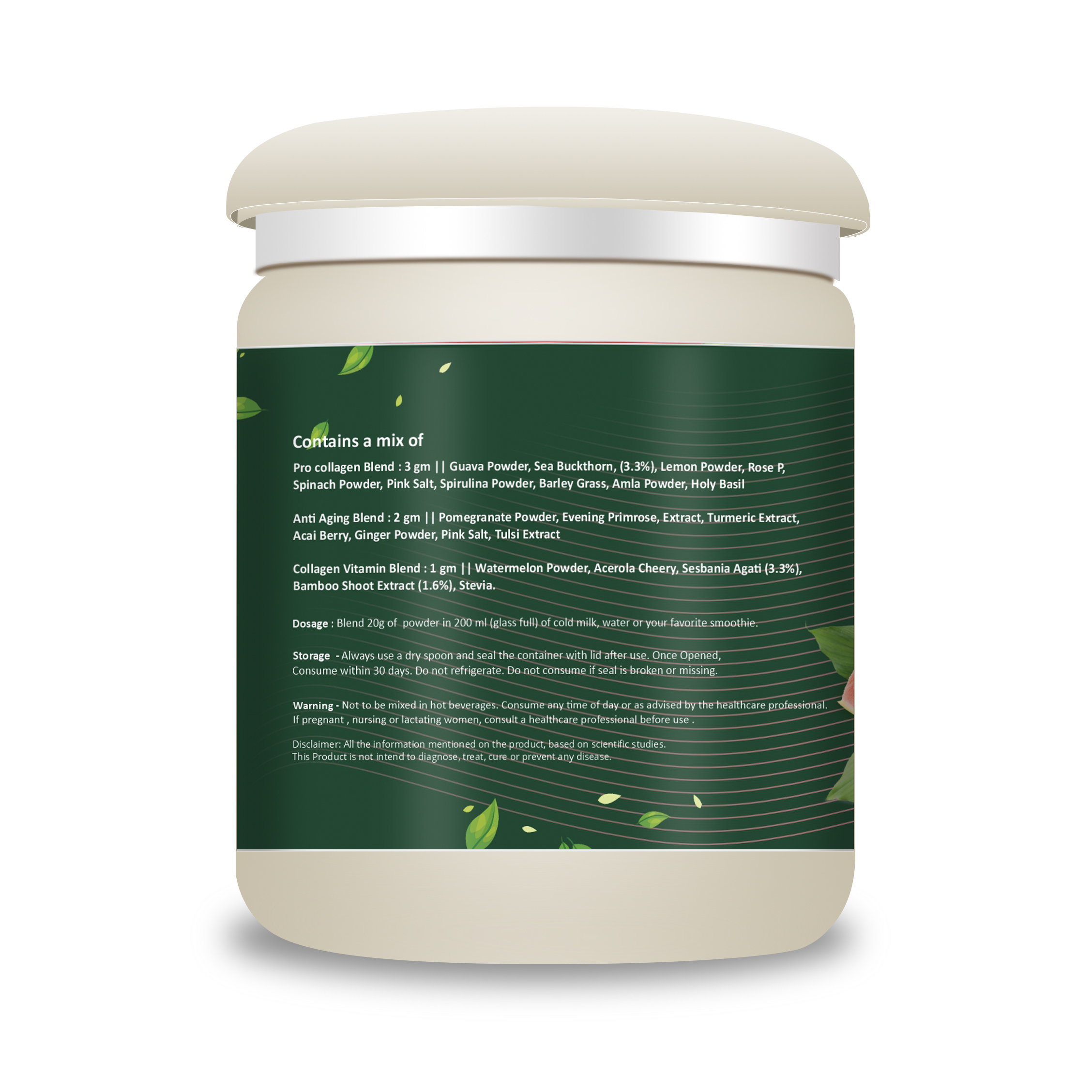 Bhumija lifesciences Plant-Based Collagen Powder blends Evening Primrose, Sea Buckthorn, Pomegranate, Guava, and Rose extract to support firmer, smoother and naturally glowing skin. A clean, vegan collagen builder that helps improve hydration, elasticity and radiance without animal collagen. With natural Vitamin C from fruit extracts, this collagen builder supports the skin’s own collagen-making process, helping improve firmness and smoothness over time