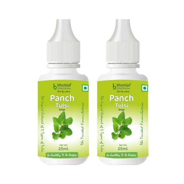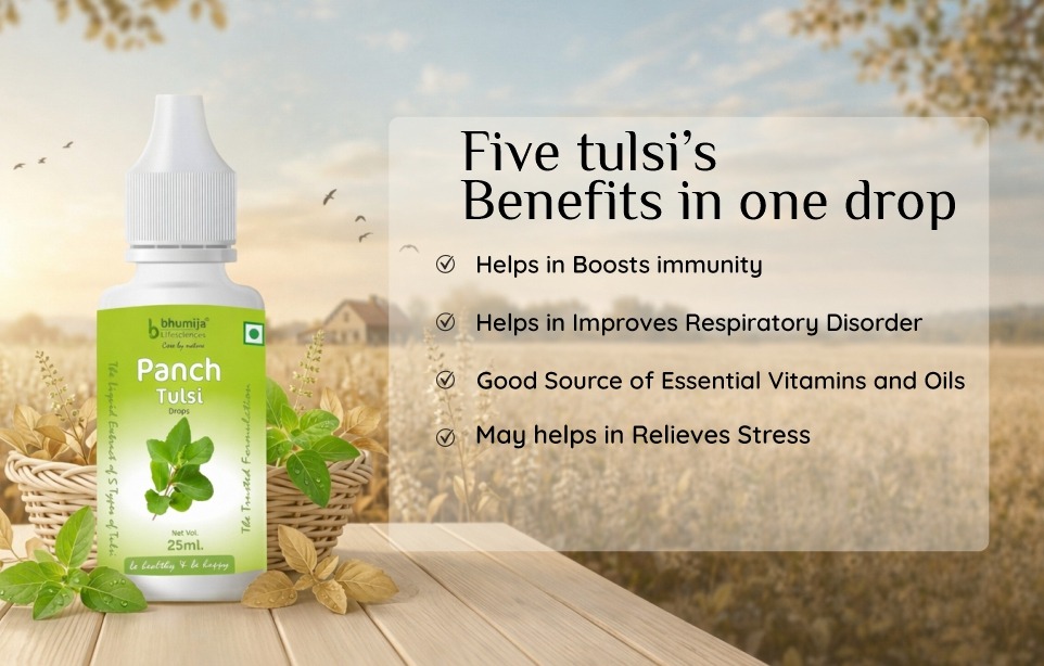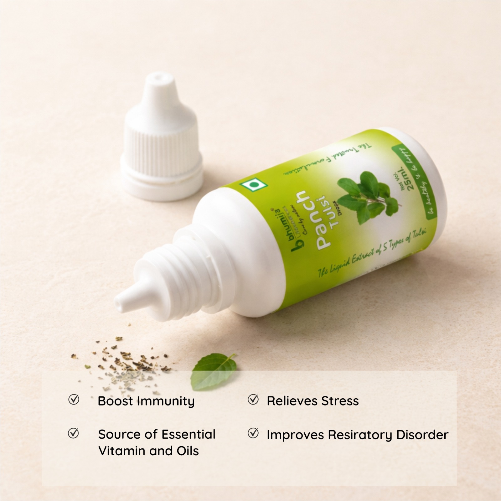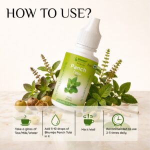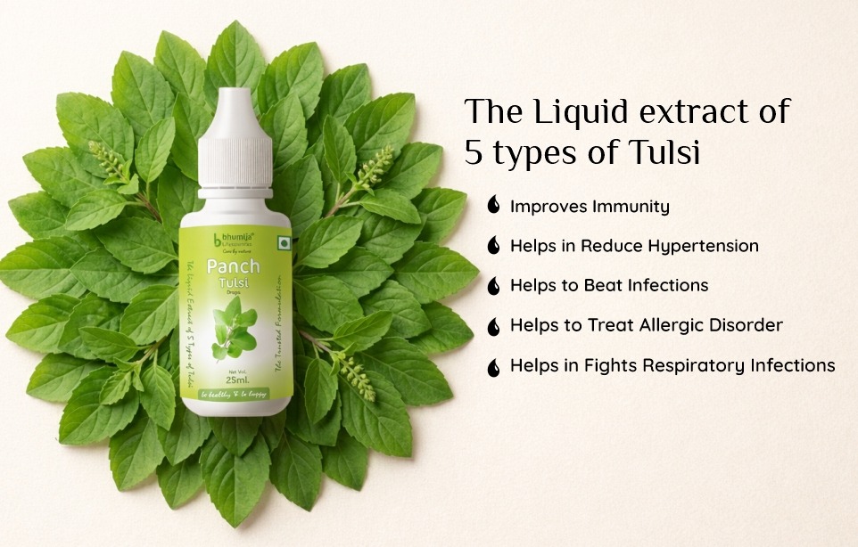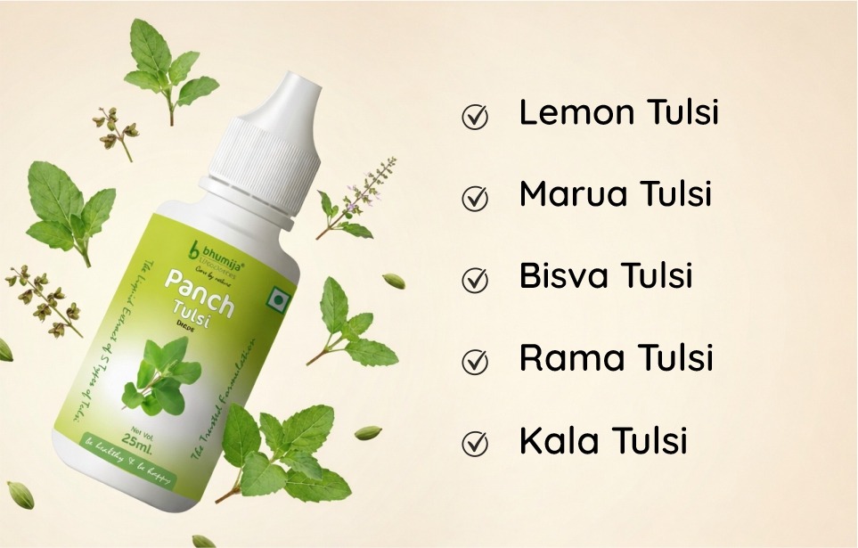 Bhumija Panch Tulsi Drops bring together the strength of five types of tulsi drop to support immunity, throat comfort, digestion, and overall wellness. simple daily habit that combines the wisdom of Ayurveda with modern convenience. Just a few drops for complete Tulsi goodness.